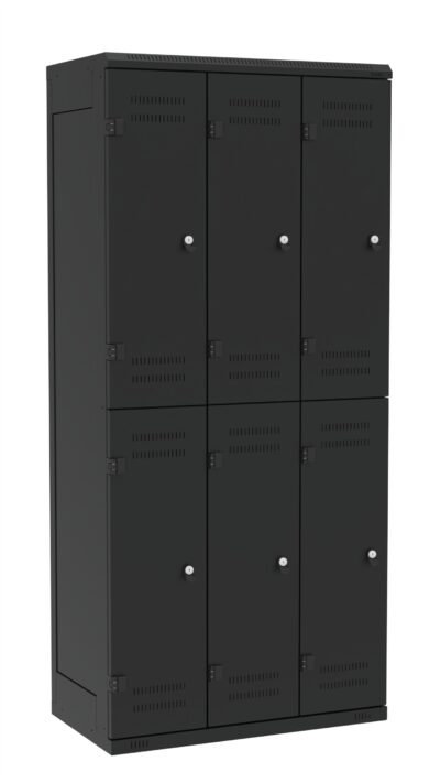 La construction du cadre soudé en tôle d'acier d'une épaisseur de 0,8 à 1 mm garantit la solidité et minimise le temps de montage. Le vestiaire métallique à 6 portes offre une utilisation optimale de l'espace et convient parfaitement aux locaux dans lesquels de nombreuses personnes doivent ranger leurs vêtements et leurs effets personnels en toute sécurité.